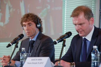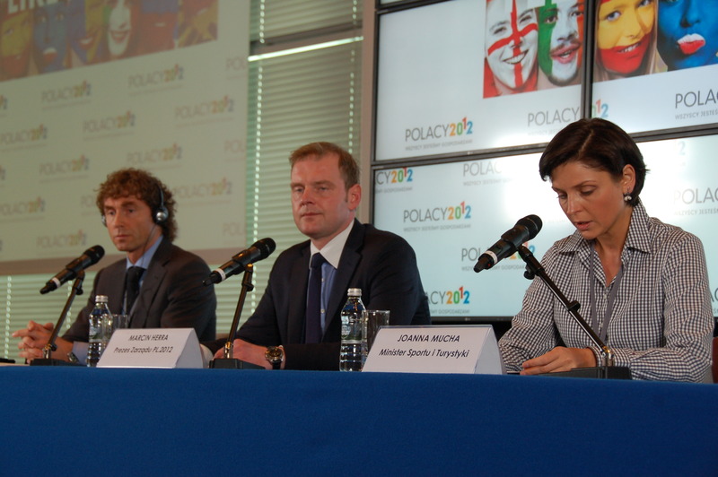 Joanna Mucha, Minister Sportu i Turystyki oraz Marcin Herra, prezes spółki PL.2012 podczas czwartkowej konferencji prasowej podsumowali szósty dzień EURO 2012.Gościem specjalnym był Marcel Bruelhart, który był odpowiedzialny za przygotowanie mistrzostw Europy w szwajcarskim Brnie.