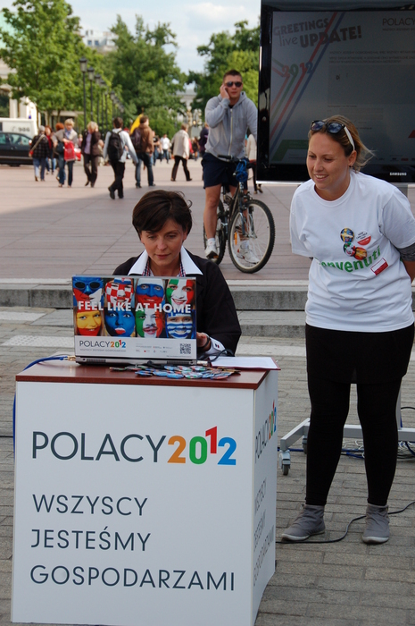 – Kampania „Polacy 2012. Wszyscy jesteśmy gospodarzami" ruszyła 25 maja 2012 roku. W TVP i Polskim Radio pojawiły się spoty promujące akcję, blisko 10 tys. Polaków zamówiło zestawy – plakaty i znaczki, udostępnione zostały aplikacje mobilne „Polish Guide 2012" i „Check-in Poland - podsumowała dotychczasowe efekty akcji Joanna Mucha. – To wyjątkowa okazja aby po raz kolejny pokazać naszą polską gościnność wszystkim zagranicznym kibicom – kontynuowała Minister Sportu i Turystyki.