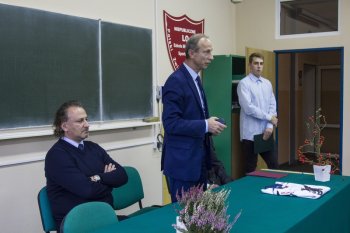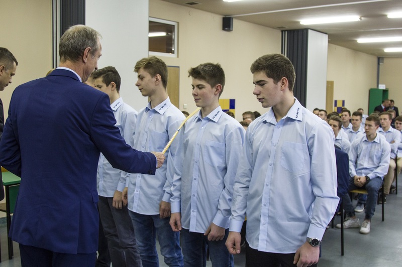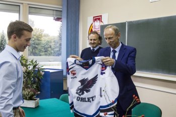 Podczas uroczystości uczniowie klasy I złożyli ślubowanie na Sztandar Szkoły i zostali pasowani na uczniów – zawodników NLO SMS PZHL w Sosnowcu. Uczniowie wręczyli Panu Ministrowi pamiątkową koszulkę hokejową Szkoły Mistrzostwa Sportowego. Wszyscy obecni na uroczystości zostali zaproszeni na mecz, w którym zawodnicy SMS- u zmierzą się z drużyną Zagłębia Sosnowiec.