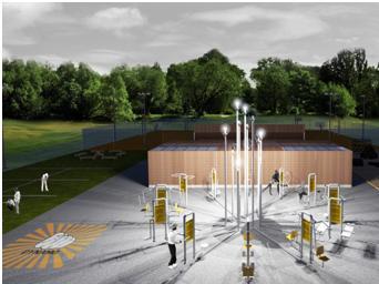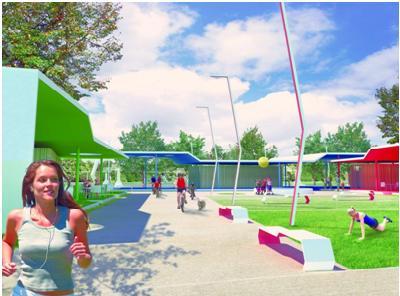 W projekcie dużo uwagi poświęcono aspektom społecznym, przeanalizowane zostały potrzeby i oczekiwania różnych użytkowników zespołów sportowo-rekreacyjnych. Interesująca jest propozycja centralnego placu - miejsca spotkań i integracji. Plac został "obudowany" modułowymi kontenerami połączonymi falującym dachem. Atrakcyjne zadaszenia oraz wprowadzenie programu gastronomicznego pozwoliły wytworzyć przestrzeń publiczną.