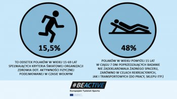 Badania Eurobarometru pokazują, że 59% Europejczyków nie uprawia sportu lub uprawia go rzadko. Badania dotyczące Polski również są alarmujące. W 2015 r. odsetek Polaków w wieku 15-69 lat spełniających kryteria WHO dot. aktywności fizycznej podejmowanej