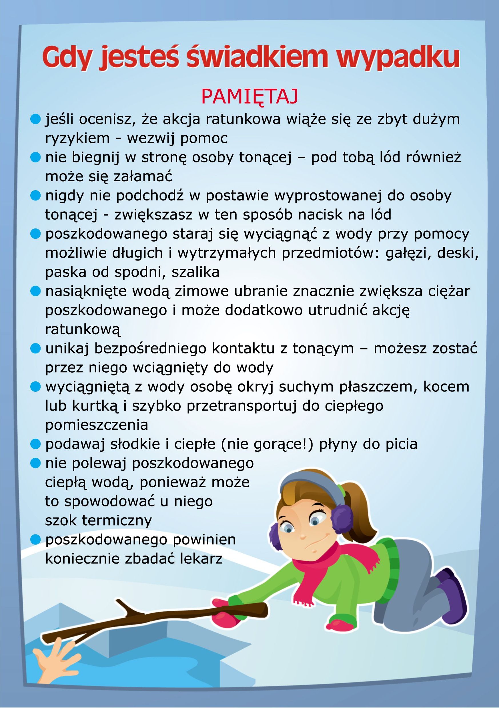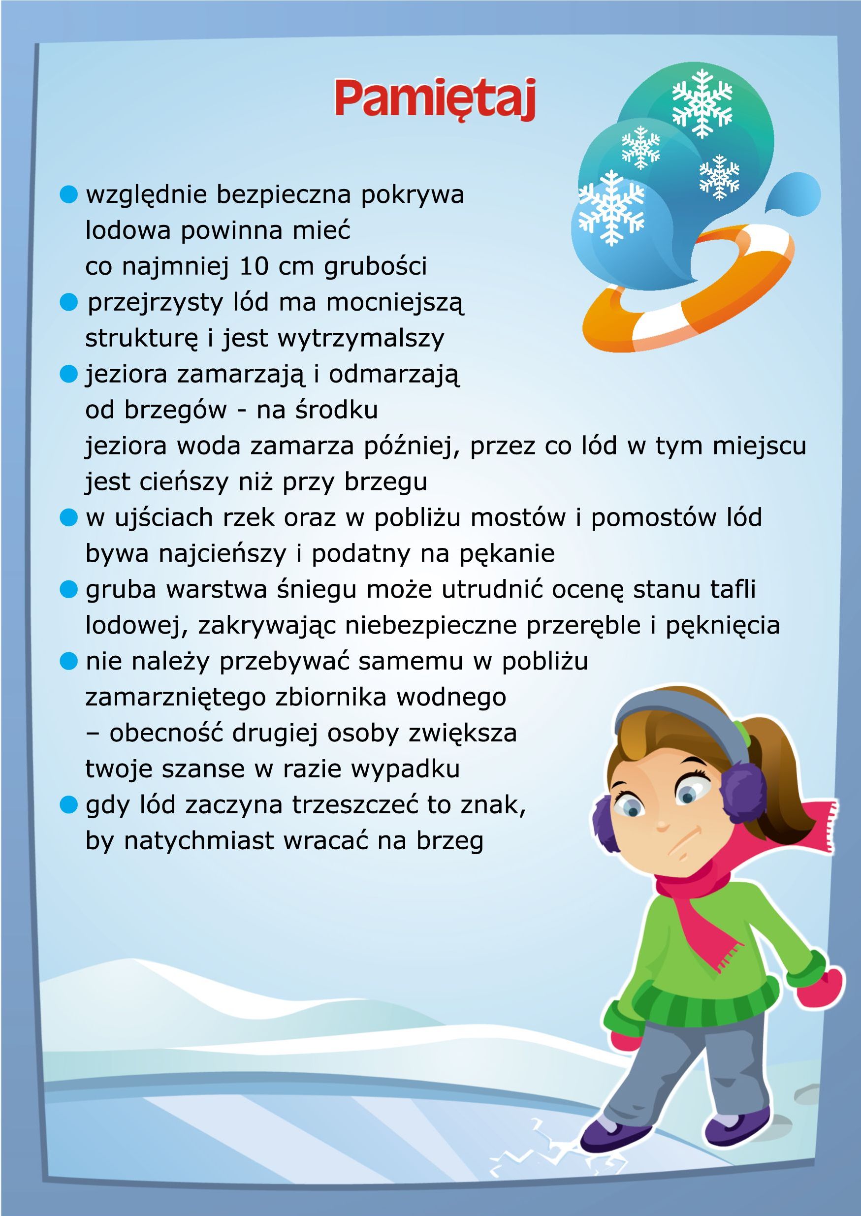 Powyższe materiały edukacyjno-informacyjne stanowią pomoc dydaktyczną w ramach zajęć szkolnych na temat zagrożeń związanych z przebywaniem na zamarzniętych rzekach, stawach i jeziorach.
