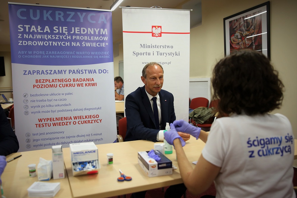 12.07.2017 r. w Ministerstwie Sportu i Turystyki odbyła się akcja bezpłatnych badań poziomu cukru we krwi oraz Wielki Test Wiedzy o Cukrzycy. Inicjatorem kampanii „Ścigamy się z cukrzycą” jest Koalicja na Rzecz Walki z Cukrzycą. Aktywność fizyczna jest jednym ze sposobów zapobiegania chorobom cywilizacyjnym – mówi minister Witold Bańka.
