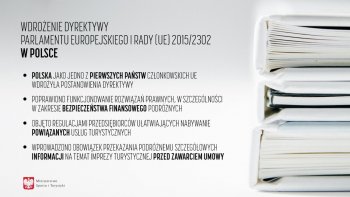 Polska jako jedno z pierwszych państw członkowskich UE terminowo i kompleksowo dokonała wdrożenia postanowień dyrektywy Parlamentu Europejskiego i Rady (UE) 2015/2302 z dnia 25 listopada 2015 r. w sprawie imprez turystycznych i powiązanych usług turystycznych, zmieniającej rozporządzenie (WE) nr 2006/2004 i dyrektywę Parlamentu Europejskiego i Rady 2011/83/UE oraz uchylającej dyrektywę Rady 90/314/EWG.