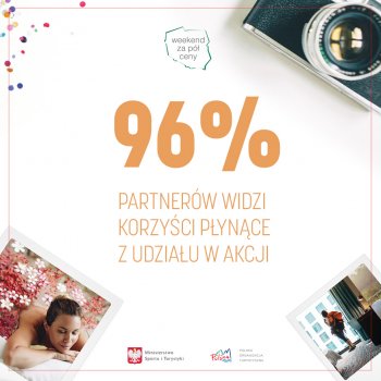 POLSKA ZOBACZ WIĘCEJ – WEEKEND ZA PÓŁ CENY to wspólna akcja Ministerstwa Sportu i Turystyki oraz Polskiej Organizacji Turystycznej, organizowana dwa razy do roku – wiosną i jesienią. Kolejna, czwarta edycja ponownie okazała się rekordowa i przyciągnęła uwagę 661 podmiotów, które zaoferowały swoje produkty oraz usługi w obniżonych o 50% cenach. Skorzystało z nich 132 000 turystów. Zarówno liczba partnerów, jak i turystów biorących udział w akcji wzrosła o niemal 20%.