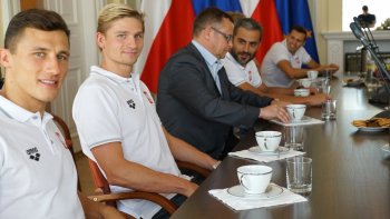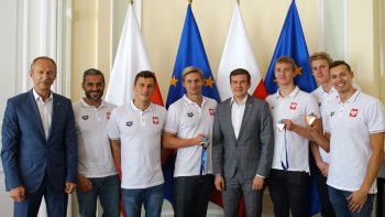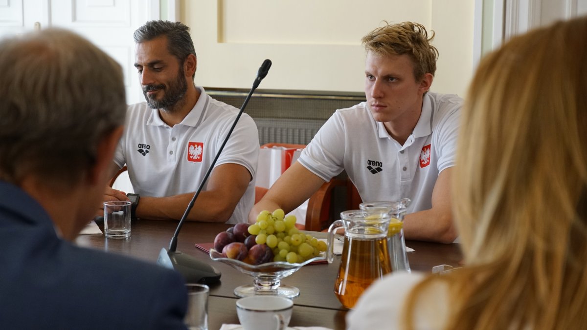 W poniedziałek 13 sierpnia br. minister sportu i turystyki Witold Bańka gościł w siedzibie MSiT medalistów Mistrzostw Europy w Pływaniu, które odbyły się w Glasgow. W spotkaniu obok zawodników uczestniczyli trenerzy: Michał Szymański – trener sztafety, Maciej Certa – trener R. Kawęckiego, Paweł Słomiński, prezes Polskiego Związku Pływackiego oraz Marcin Nowak, dyrektor Departamentu Sportu Wyczynowego MSiT.