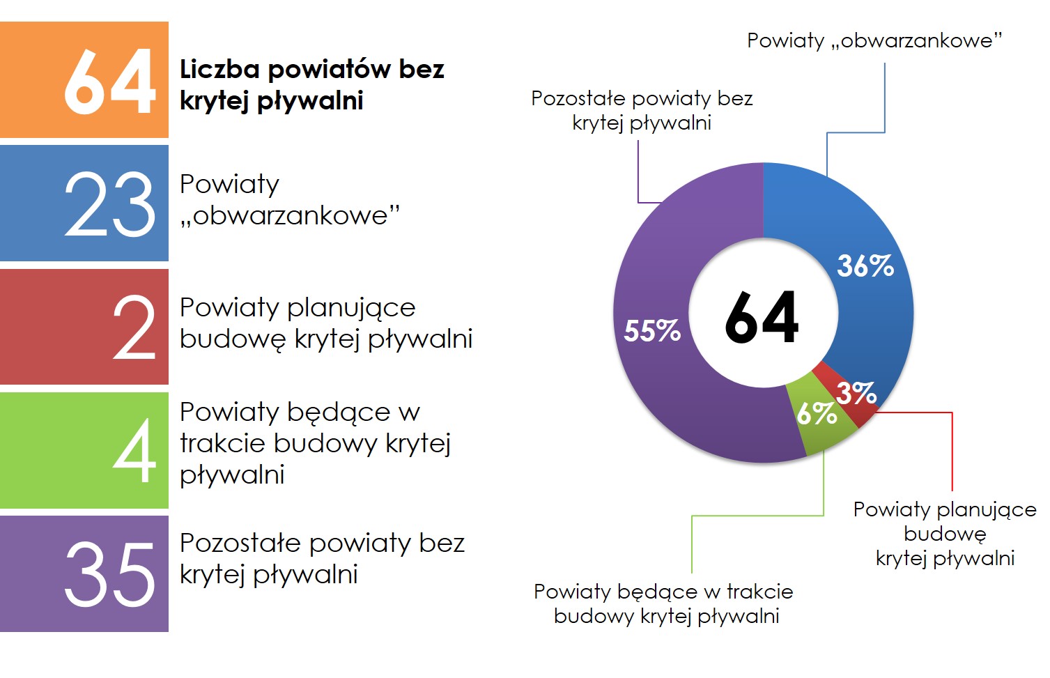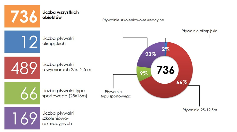 Z zebranych informacji wynika, iż na 380 powiatów w Polsce 316 posiada pływalnię krytą na swoim terenie, a 64 powiaty nie posiadają takiego obiektu. Łączna liczba ogólnodostępnych krytych pływalni w Polsce, składających się z przynajmniej jednej niecki o długości min. 16 metrów wynosi 736 obiektów. Składają się na nie: 12 pływalni olimpijskich, 66 pływalni typu sportowego (25x16 m), 489 pływalni o wymiarach 25x12,5 m oraz 169 pływalni szkoleniowo rekreacyjnych (min. 16 m).
