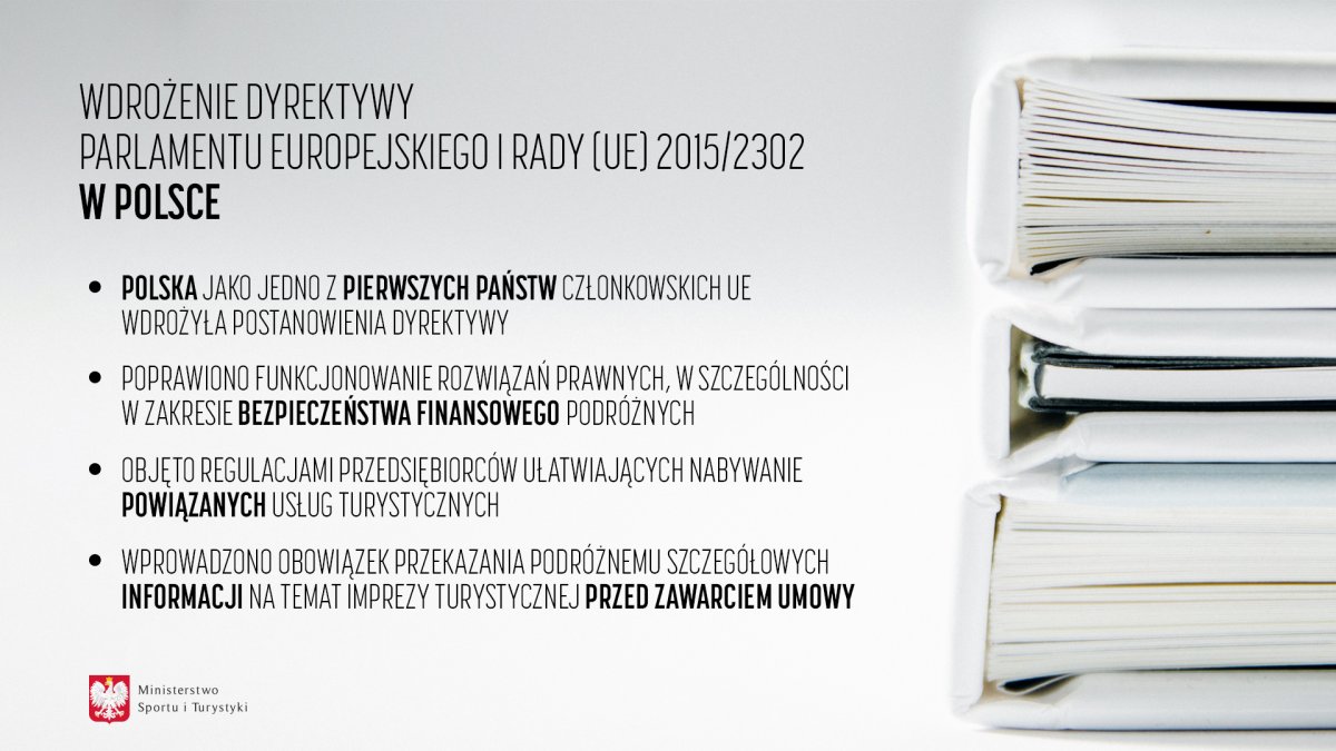 Polska jako jedno z pierwszych państw członkowskich UE terminowo i kompleksowo dokonała wdrożenia postanowień dyrektywy Parlamentu Europejskiego i Rady (UE) 2015/2302 z dnia 25 listopada 2015 r. w sprawie imprez turystycznych i powiązanych usług turystycznych, zmieniającej rozporządzenie (WE) nr 2006/2004 i dyrektywę Parlamentu Europejskiego i Rady 2011/83/UE oraz uchylającej dyrektywę Rady 90/314/EWG.